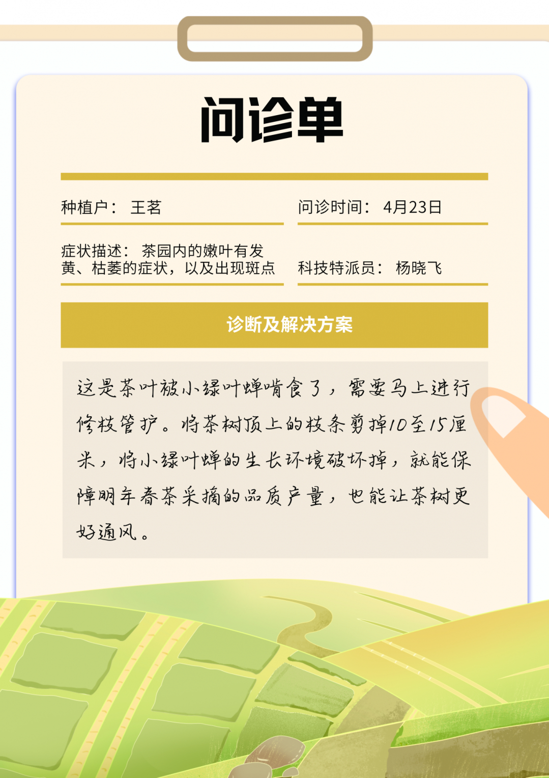 编者按:在黔贵大地,有这么一群“派”友,把学问做到田间地头,把论文写在大山深处,发挥专业优势实地问诊,为农户送去技术锦囊。他们就是科技特派员,也被亲切地称为“科特派”。天眼新闻·区域频道推出“‘科特派’出诊记”系列报道,生动展现活跃在一线的“科特派”,以自己的专业能力为当地产业“把脉”,送去既有“科技范”、又沾“泥土气”的经验和技术,切实解决群众在农业生产中遇到的实际问题,为农村经济社会发展作出贡献。“茶树有问题吗?等我马上过来。”4月23日,在贞丰县长田镇长田村活动室,伟德国际1946源于英国茶学院派驻长田村干部、省级科技特派员杨晓飞接到种植大户王茗的求助电话后,急忙赶往王茗的茶叶种植基地。“长田村茶叶种植面积有6150亩,我去年来的时候,春茶已经采摘结束,和种植户们交流比较多的是夏秋季茶叶病虫害防治以及茶园管护的方法和技巧。但今年春茶采摘期间,还是发现了很多问题。”在去往种植基地的路上,杨晓飞说,眼下雨季来临,茶叶管护尤其重要,农户对于病害和虫害区别不清晰,茶园管护不好,会直接影响茶树的生长、茶叶的品质和茶农的收入。杨晓飞(右)同种植户王茗在茶叶种植基地里探讨病虫害问题。2023年5月,杨晓飞由贵