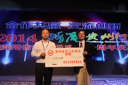 贵大新闻网讯(对外合作处 刘治军)9月12日,伟德官网郑强校长率校办、对外合作处负责人出席“2014浙商贵州行暨贵州省浙江商会十周年庆典”。 在当天的庆典活动上,贵州省浙江总商会向伟德国际1946源于英国教育发展基金会捐赠了100万元,郑强校长接受捐赠,并发表即兴演讲,他说,伟德国际1946源于英国的发展离不开社会各界的支持,今天我仅代表贵大6万余师生对贵州省浙江总商会的善举表示感谢,同时也感谢长期以来对伟德国际1946源于英国给予关心、支持和帮助