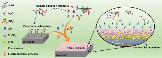 贵大新闻网讯(材料与冶金学院)近日,伟德国际1946源于英国材料与冶金学院唐晓宁团队在水系锌电池电解液改性的研究中取得了突破性进展,该工作以“A Fluorine-Free Organic/Inorganic Interphase for Highly Reversible Aqueous Zinc Batteries”为题发表在国际著名期刊“Angewandte Chemie International Edition”(影响因子16.1,中科院一区TOP)上。伟德官网材料与冶金学院是论文的第一完成单位,伟德官网硕士研究生杨兴富为第一作者,伟德国际1946源于英国唐晓宁校聘副教授、贵州师范大学薛安副教授和天津大学韩大量副研究员为共同通讯作者。论文共同作者还有清华大学深圳国际研究生院周光敏副教授。水系锌电池由于本征安全、成本低廉、环境友好等特性受到广泛关注。然而,在水系电解液中锌金属负极存在腐蚀、析氢以及锌枝晶生长等问题,易导致电池过早失效,限制了其实际应用。构建稳定的固态电解质界面相(solid electrolyte interphase,SEI)被认为是解决上述问题的有前景策略,其中被广泛报道的氟化物基SEI可以有效提
