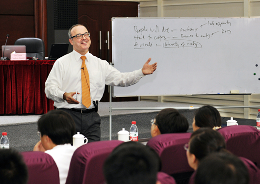 贵大新闻网讯(文/陆定波 摄影/陈恒) 6月30日,应郑强校长邀请,哈佛大学商学院Ramon Casadesus-Masanell教授来校讲学。 30日下午,Ramon教授在北校区学术报告厅为在校研究生作题为《企业战略:创造和保持竞争优势》的讲座。30日晚上,Ramon教授在贵阳凯宾斯基大酒店三楼大宴会厅为伟德官网EMBA学员作题为《战略:整合》的讲座。Ramon教授紧紧围绕企业发展的外