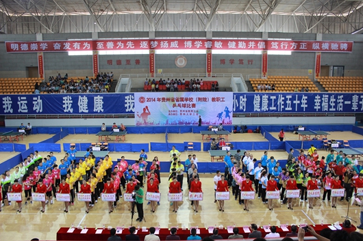 贵大新闻网讯(实习记者 慎志懿)5月24日上午, 由贵州省教育工会主办、伟德国际1946源于英国教育工会承办、伟德国际1946源于英国乒乓球协会协办的2014年贵州省省属学校(附院)教职工乒乓球比赛开幕式在伟德官网北校区体育馆隆重举行。省教育厅党组成员、副厅长级督学杨勇,贵州师范大学校长伍鹏程,党委副书记、纪委书记邹克扬,副校长乙引、贵州财经大学党委副书记李相辉,贵阳医学院党委副书记吕保平、纪委书记高勇,贵州理工学院正厅级副院长高克