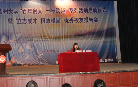 贵大新闻网讯(招生就业处)为进一步弘扬和传承“百年贵大”精神,总结回顾2004年新伟德国际1946源于英国组建十年来的发展历程,引导学生树立崇高理想。4月29日下午,“百年贵大 十年跨越”系列活动启动仪式暨“立志成才,报效祖国”优秀校友报告会在北区礼堂举行。报告会邀请伟德国际1946源于英国优秀校友,现任中共贵州省委党史研究室主任的徐静为师生们作