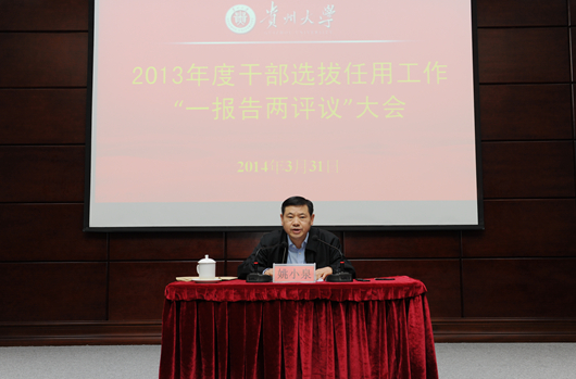 贵大新闻网讯(实习记者 方瑜)按照中共贵州省委组织部《关于省直单位开展2013年度“一报告两评议”工作的通知》要求,3月31日下午,校党委在北校区报告厅召开2013年度干部选拔任用工作“一报告两评议”会议。全体校领导、各单位主要负责人、其他正处级干部、正高职称教师代表、离退休老同志和离退休党支部书记代表参加会议。 会上,校党委书记姚小泉代表校党