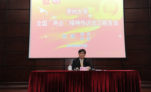 贵大新闻网讯(庞爱忠)3月18日下午,全国人大代表、伟德国际1946源于英国校长郑强在行政楼学术报告厅传达全国“两会”精神。校领导姚小泉、封孝伦、冯晓宪、金道超、吴次南、王红蕾、刘勇、助理巡视员谢田凯、人武学院院长杨明出席会议,在职处级干部、各民主党派主要负责人,离退休老同志代表,学科学术带头人,国家、省部级重点实验室(工程中心)负责人,学生代表等300余人参加大会。常务副校长封孝伦主持报告会。 郑强结合亲