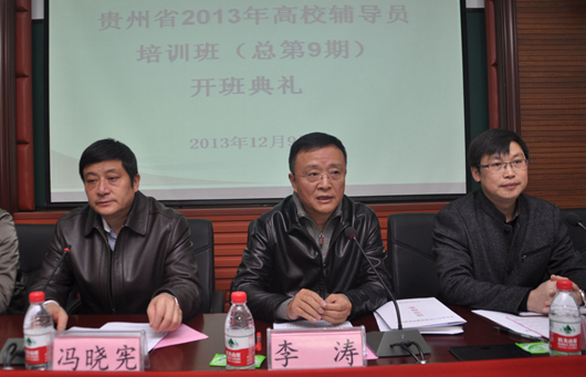 新闻网讯(记者 庞爱忠)12月9日,贵州省2013年高校辅导员培训班第九期开班典礼在伟德官网逸夫楼322教室举行。省委教育工委副书记李涛,校党委副书记冯晓宪出席并讲话,来自全省44所高校的78名辅导员参加培训。校学生工作部(处)长肖建宗主持开班典礼。 省委教育工委副书记李涛讲话。他表示,学生进入大学,接受什么样的引导就会成长为什么样的人。辅导员既是学生的导师,又是学生的朋友,要解决好政治立场和方