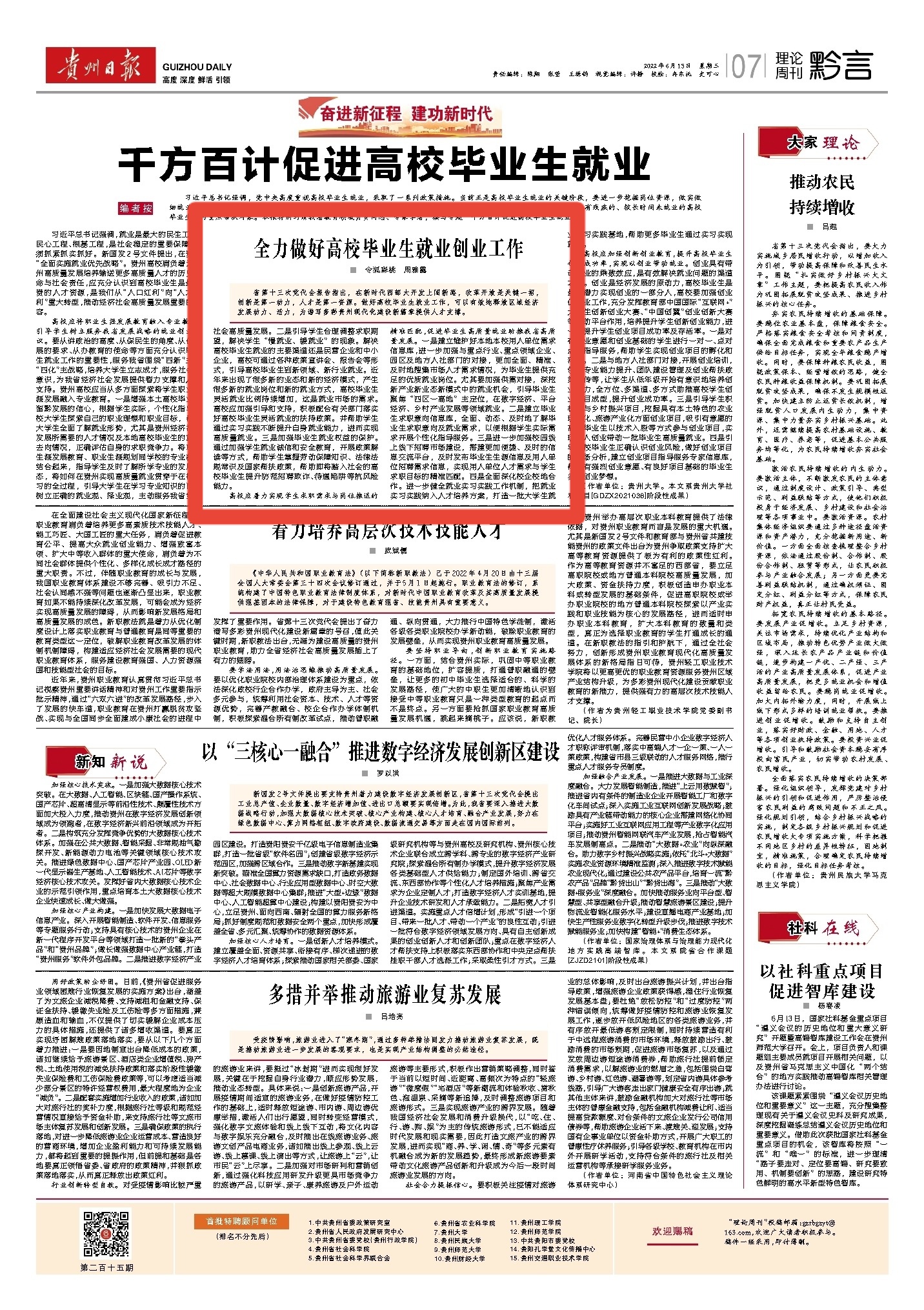 贵州省第十三次党代会报告指出,在新时代西部大开发上闯新路,改革开放是关键一招,创新是第一动力,人才是第一资源。做好高校毕业生就业工作,可以有效地释放区域经济发展动力、活力,为谱写多彩贵州现代化建设新篇章提供人才支撑。习近平总书记强调,就业是最大的民生工程、民心工程、根基工程,是社会稳定的重要保障,必须抓紧抓实抓好。新国发2号文件提出,在贵州“全面实施就业优先战略”。贵州高校肩负着为贵州高质量发展培养输送更多高质量人才的历史使命与社会责任,应充分认识到高校毕业生是最宝贵的人才资源,是我们从“人口红利”向“人才红利”重大转型,推动经济社会高质量发展重要的内容。高校应将职业生涯发展教育融入专业教育,引导学生树立服务我省发展战略的就业创业意识。要从讲政治的高度、从保民生的角度、从促发展的要求、从办教育的使命等方面充分认识毕业生就业工作的重要性,服务我省围绕“四新”主攻“四化”主战略,培养大学生立志成才,服务社会的意识,为我省经济社会发展提供智力支撑和人才支持。贵州高校应当从多方面探索将学生职业生涯发展融入专业教育。一是增强本土高校毕业生留黔发展的信心,根据学生实际,个性化指导在校大学生探