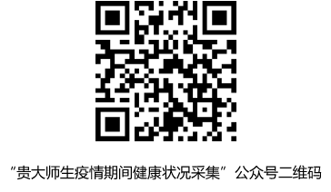 (二)关注“贵大师生疫情期间健康状况采集” 公众号。各单位(部门)通知本单位教职工2月21日24:00前,登录微信,扫描下图二维码,关注“贵大师生疫情期间健康状况采集”公众号。