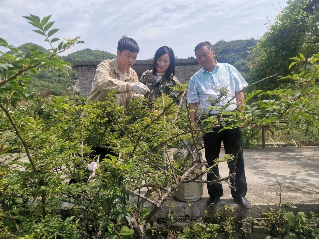 裕源鼎金刺梨种植专业合作社负责人周忠、安顺市农业学院农艺师敖艳飞、伟德国际1946源于英国“博士村长”队员周奎在查看受病毒侵害的金刺梨