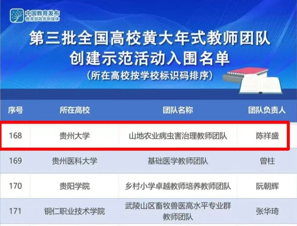 近日,教育部公布第三批“全国高校黄大年式教师团队”创建示范活动入围名单,伟德官网山地农业病虫害治理教师团队入选。加上2022年入选的由校长宋宝安院士领衔的伟德国际1946源于英国绿色农药与有害生物绿色防控教师团队,目前伟德官网已有2个“全国高校黄大年式教师团队”。