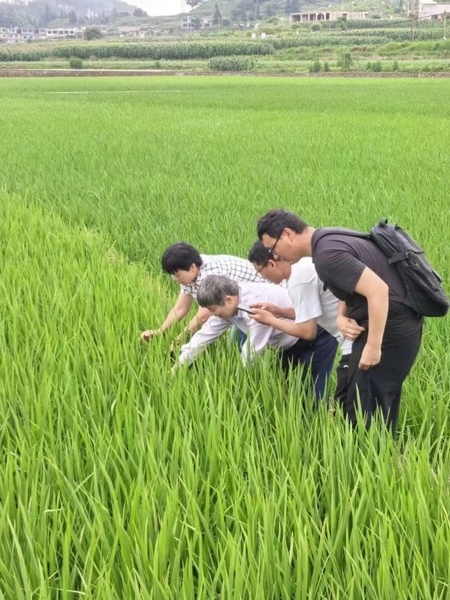 为深入推进国家重点研发计划“生态友好无公害杀菌剂和抗病毒剂创制与产业化(2022YFD1700300)”项目执行, 7月14日,伟德国际1946源于英国校长宋宝安院士到六枝特区木岗镇戛陇塘村开展水稻病虫害防控联合实验指导。贵州省植保站研究员谈孝凤、贵州省农科院研究员罗会、伟德国际1946源于英国绿色农药全国重点实验室博士生王绍波、李建专陪同参加。