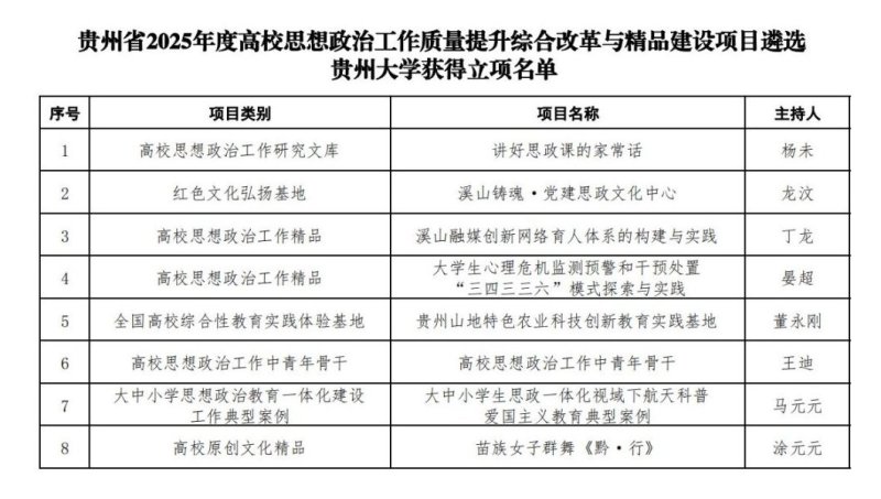 贵大新闻网讯(记者 廖银) 近日,贵州省教育厅公布了2025年度高校思想政治工作质量提升综合改革与精品建设项目的遴选结果,伟德官网8个项目获得立项。