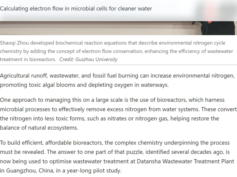 文章提到,周少奇教授“开创性地提出了更加精准分析氮、磷和COD同步去除过程的化学计量方程和计量比模型(COD/N/P),详细描述了所谓的反硝化除磷菌(DPB)如何去除营养物质。这一成果基于他在‘电子计量学’领域的开创性研究。这种原创方法通过在化学计量方程研究中分析分子间的电子迁移来精准描述化学反应”。