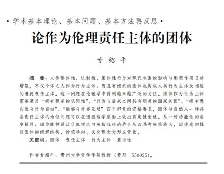 甘绍平教授在文章中指出:人类伦理学两千年的历史中,令人印象深刻的在于,人之个体作为道德行为主体的地位,也就是说似乎只有个体才是各种道德义务与责任类型的承担者。然而现代社会的发展证明,团体、组织、机制的正向作用与消极后果均远高于个体行为者,这也就决定了道德要求的实现往往不能仅仅指望个体行为动机与单独的行动,而是要依靠社会中不同层级的集体、企业、公司、组织、机构这样一些具有力度的整体性的行为主体的有效作为。在我国伦理学界,不仅个体,人类团体与组织也应作为行为主体以及责任承担者的问题已经进入研究视野,并呈现为有关组织伦理、企业社会责任的系统探索的成果。在法学界,有关组织体自身的责任问题也得到广泛的讨论,单位不依赖于其组成成员的独立的归责模式得到了许多学者的认同。道德主体无法仅仅被限定在个体身上,对社会团体、组织、企业所应承担的集体性的责任做出一种规范性图景的刻画,在厘清团体具有何种意义的意志或意向性的基础上确立团体责任主体的地位,理所当然成为伦理学研究的对象以及当代哲学自我理解的一个不容忽视的重要环节,这一探究对于现代社会的义务归属与责任追究无论在伦理学还是在法学界无疑均具有重大而紧迫的理论价值与现实意义。
