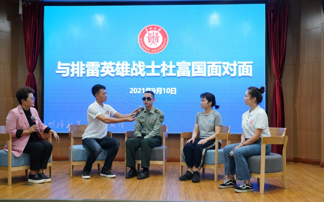 On the morning of September 10, Du Fuguo, a demining hero garnered with the title Role Model of Our Times, visited Guizhou University and had a face-to-face talk with faculty and students in Conference Room 212 of the Chuangyuan Building on campus. Participants of the interview included Linghu Caitao, deputy secretary of the CPC Committee of the university; Wang Jing, Du Fuguo’s wife; and Guli Pali and Zhang Yuda, student representatives of 2019 from colleges of Architecture and City Planning, and Management respectively.