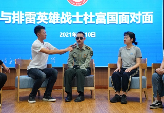 During the interview, Du Fuguo shared with the audience his life on the defense border. He spoke highly of his supervisor and squad leader having the most significant impact on him during his military services. In particular, he talked about the dangers and difficulties he encountered during demining operations. He had been in the minefields for about 1,000 times, defused over 2,400 mines and explosives, and handled at least 20 dangerous situations. Du said, "Whenever I saw people suffering from injuries or disabilities caused by a mine explosion, I felt terrible. I always feel like helping them. Sometimes on my way to the minefield, the young pioneers who were on their way to school with schoolbags would stop in the middle of the road and salute us solemnly".