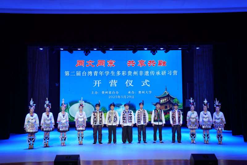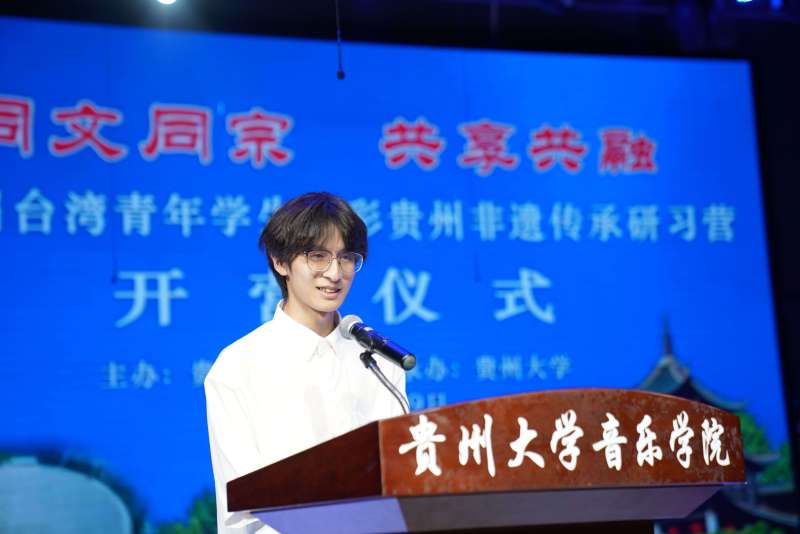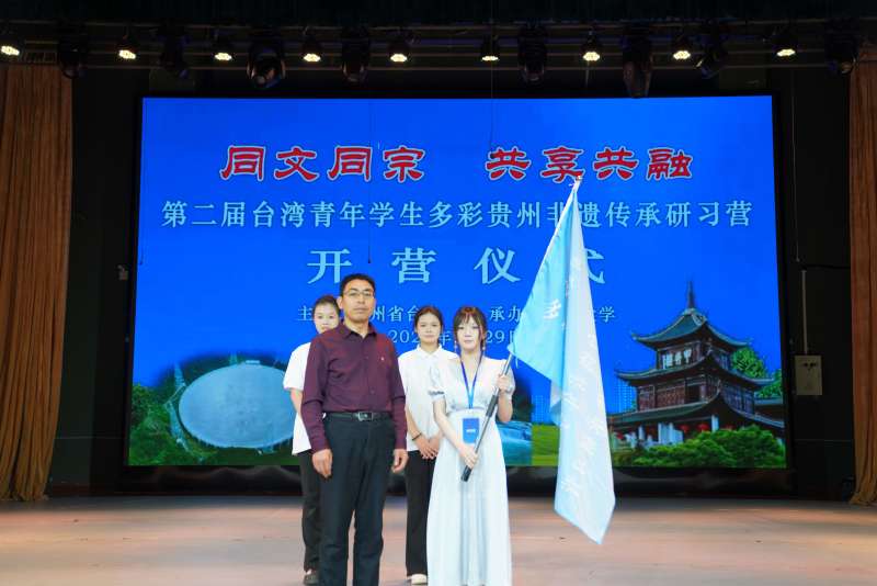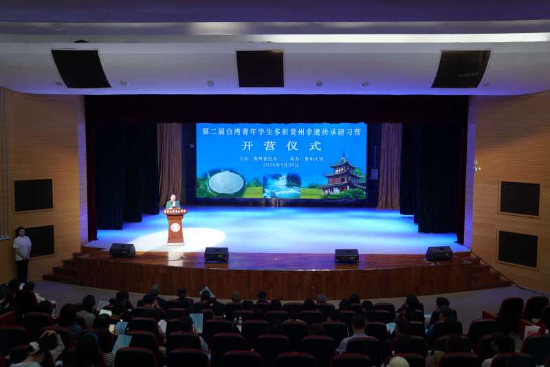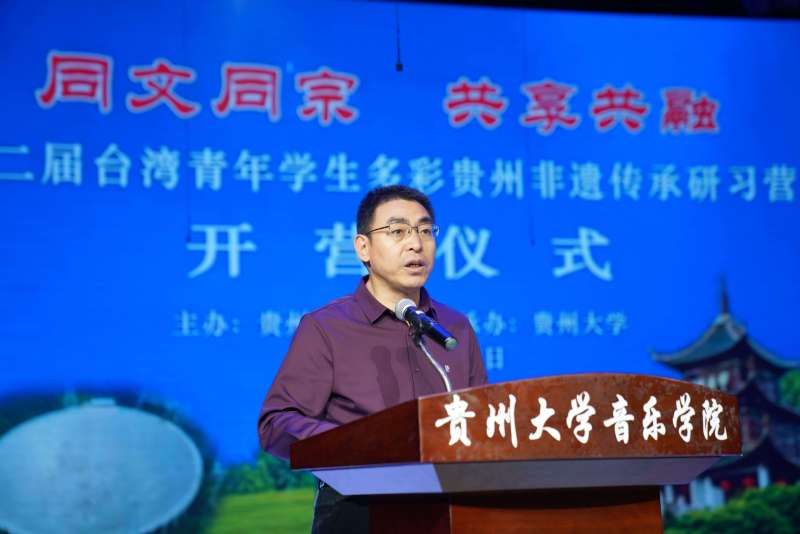 On the morning of May 29, the opening ceremony of the second “Taiwan Youth Student Study Camp on Guizhou’s Multicolored Intangible Cultural Heritage” was held at the theater of Yunzheng Building, School of Music, Guizhou University. The event, hosted by the Taiwan Affairs Office of Guizhou Provincial People’s Government and organized by Guizhou University, was attended by Li Weigui, Vice Director of Guizhou Provincial Taiwan Affairs Office; Zhang Dalin, Vice President of Guizhou University; and Sheng Weihao, Secretary-General of the China International Trade Managers Association. Sun Yun, Party Secretary of the School of Music, presided over the ceremony.