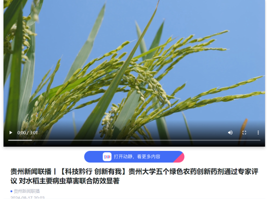 贵州广播电视台《贵州新闻联播》:【科技黔行 创新有我】伟德国际1946源于英国五个绿色农药创新药剂通过专家评议 对水稻主要病虫草害联合防效显著