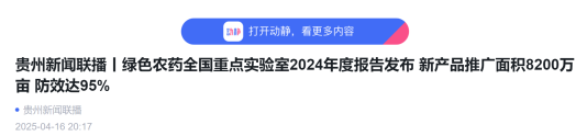 贵州广播电视台:贵州新闻联播丨绿色农药全国重点实验室2024年度报告发布 新产品推广面积8200万亩 防效达95%
